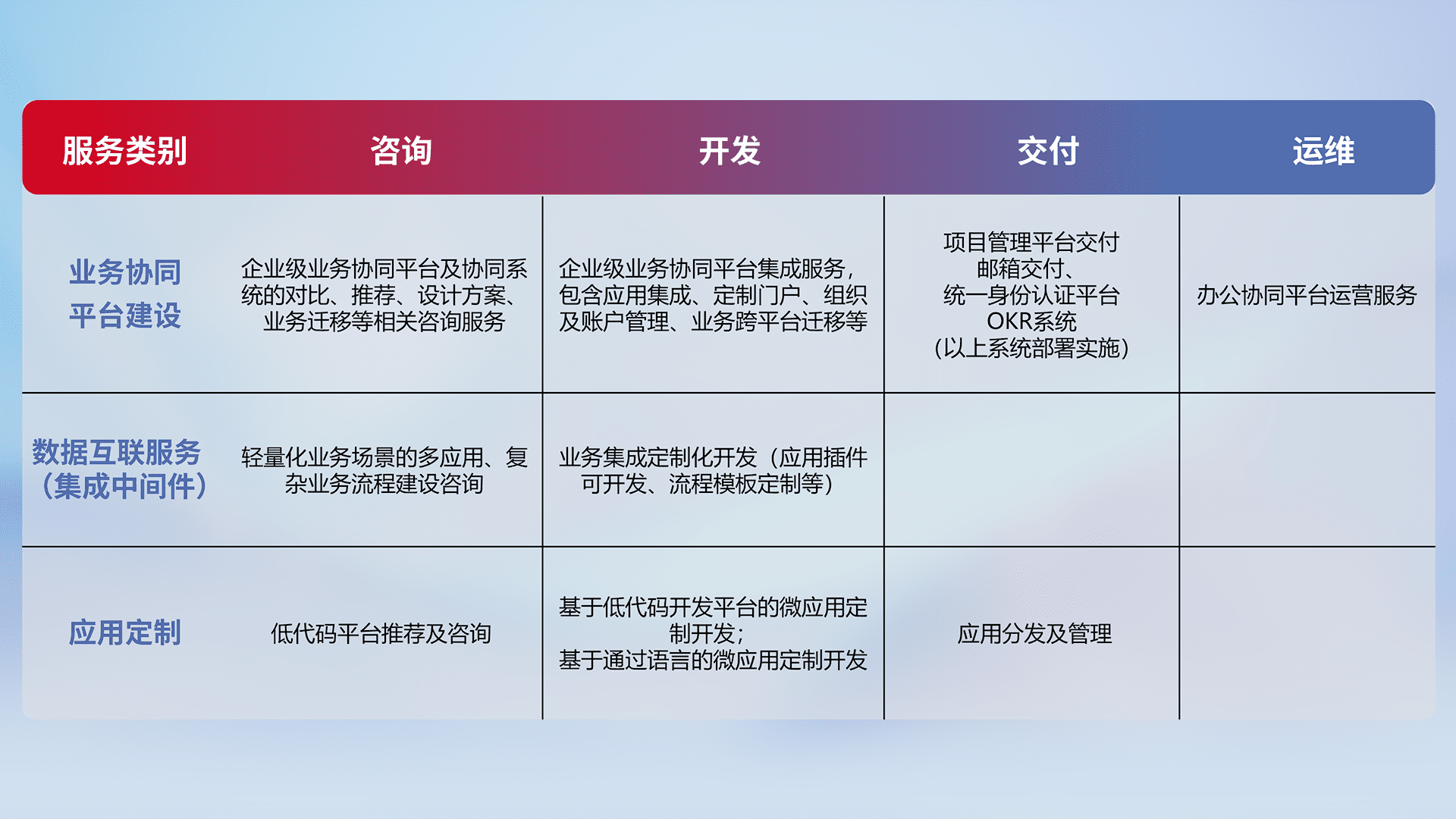 针对钉钉、、、企微、、、、IDaas等平台级产品提供产品的规划、、方案、、、交付、、定制化开发等服务,,,实现如统一协同办公、、、智能客户服务、、、、混合会议管理、、、、智能数据查询、、等业务场景,,实现数字化转型。。。。