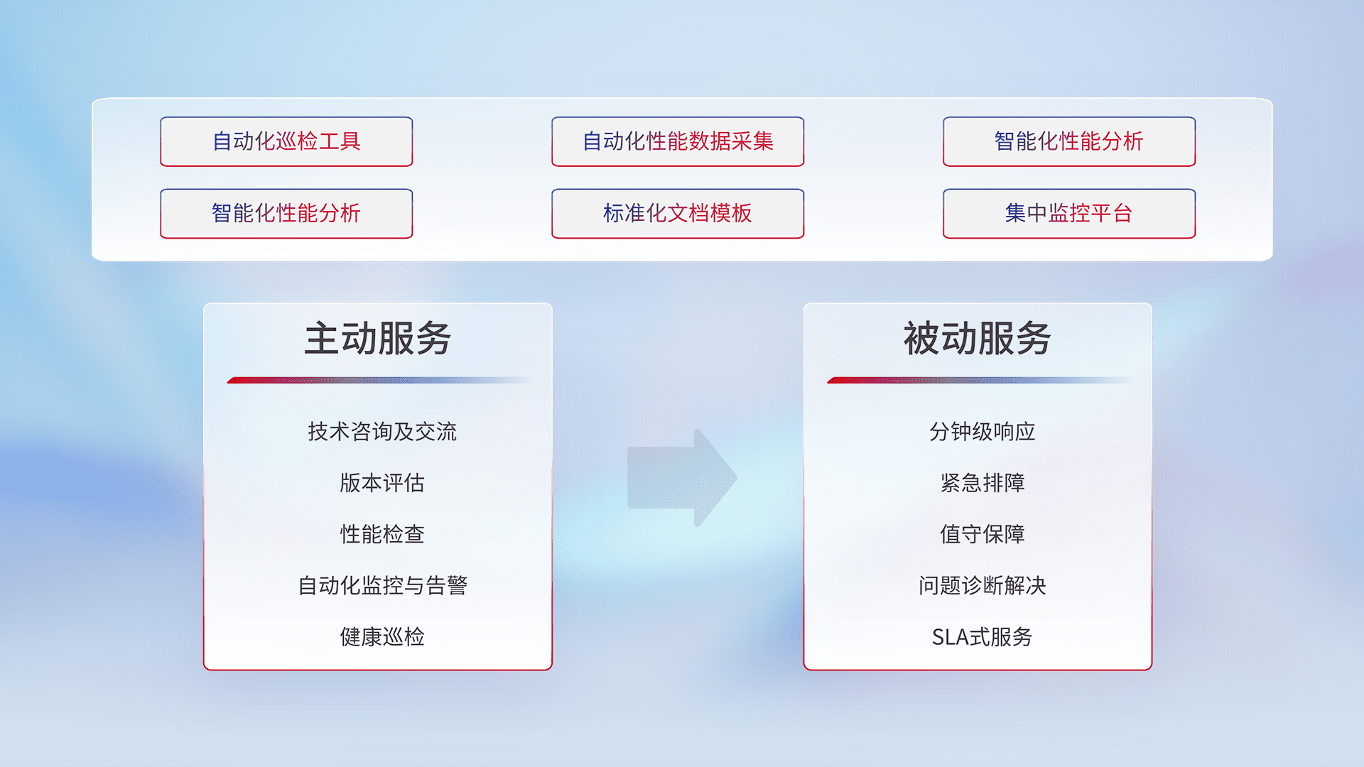 智能化工具和标准化文档,,,保障服务质量,,,,提供主动服务(包含技术咨询、、版本评估、、、、性能检查、、自动化监控与告警、、健康巡检)和被动服务包含(分钟级响应、、、紧急排障、、值守保障、、、问题诊断解决、、、SLA服务)。。